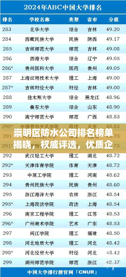 是崇明区防水公司的排名榜,在选择防水公司时,除了参考排名榜外,还应考虑公司的实际业绩、口碑和服务范围等因素,希望本文能为您在选择崇明区防水公司时提供一定的帮助。
