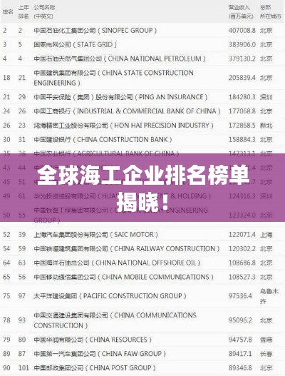 海洋工程,简称海工,是一个涉及多个领域的综合性工程,包括海洋资源的开发、利用、保护和管理等,随着全球经济的发展和人口的增长,海洋资源的价值日益凸显,海工行业也迎来了前所未有的发展机遇,本文将探讨全球海工企业的竞争格局,并给出世界海工企业的排名。