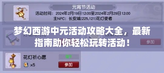 梦幻西游中元活动是一场充满挑战与乐趣的节日活动,本文为玩家提供了最新的攻略和指南,帮助玩家更好地参与活动,获取丰厚奖励,在参与活动的过程中,玩家需要注意活动时间、队伍选择、实力提升等方面,以获取更好的游戏体验,希望广大玩家能够充分利用本次活动机会,提升自己的游戏实力,享受梦幻西游的魅力。
