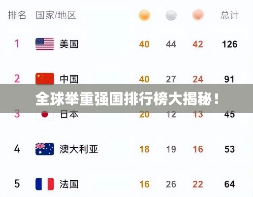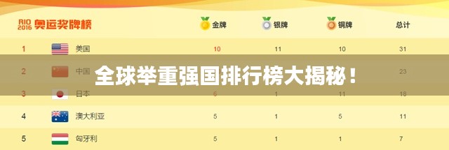 举重是一项历史悠久的运动,也是奥运会的重要比赛项目之一,全球各地的举重强国都在不断培养和发展优秀的举重选手,争夺国际比赛的荣誉,本文将介绍世界举重强国的排名,并分析其背后的原因。