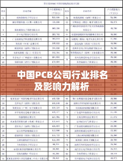 随着电子产业的飞速发展,印刷电路板(PCB)行业在中国取得了巨大的进步,众多PCB公司在国内外市场上展现出强大的竞争力,本文将探讨中国PCB公司的排名及其行业影响力,揭示这些企业在国内外市场的地位。