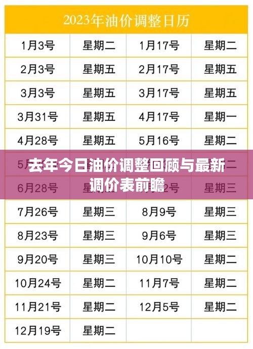 随着全球经济的不断发展和人们对能源的依赖,油价问题一直是备受关注的热点话题,本文将围绕“去年今日油价最新调价表”这一主题,对过去一年的油价变动进行回顾,并对未来油价趋势进行展望。