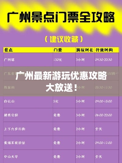 广州,一座繁华而充满活力的城市,以其丰富的历史文化、美食、购物和娱乐场所闻名于世,对于游客来说,掌握最新的广州游玩优惠攻略表至关重要,可以助你在这座城市中畅游,享受最优惠的价格,本文将为你提供最新的广州游玩优惠攻略表,帮助你充分体验广州的魅力。