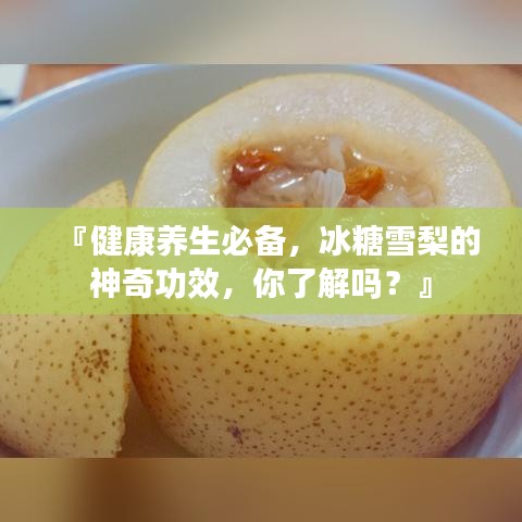 冰糖雪梨作为一种传统的营养饮品,不仅口感清甜,而且具有很好的保健作用,在繁忙的工作和生活中,我们可以适量食用冰糖雪梨来保持身体健康和预防疾病,也需要注意适量食用和食品安全问题,希望通过本文的介绍,你对冰糖雪梨有了更深入的了解,如果你还有其他关于雪梨的问题,不妨百度一下,获取更多的信息和知识,最后提醒大家,保持健康的生活方式需要多方面的努力,饮食健康只是其中的一部分,让我们一起努力,保持健康的生活方式!