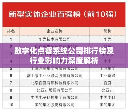 随着科技的快速发展,数字化点餐系统已成为餐饮行业的重要组成部分,本文将探讨数字化点餐系统公司的排名及其行业影响力,以揭示这些公司在推动餐饮行业数字化转型中的关键作用。
