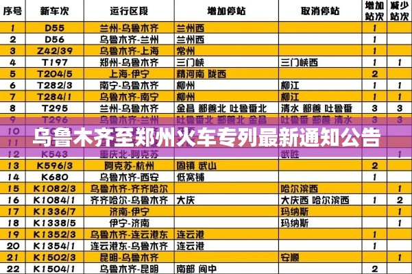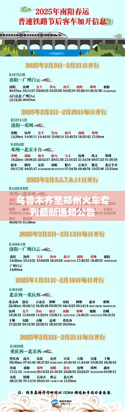 了解乌鲁木齐至郑州火车专列的最新通知对于旅客来说至关重要,通过本文的介绍,旅客们可以更好地了解列车时刻、票价、乘车须知以及服务设施等信息,在疫情期间,了解最新的通知还能帮助旅客做好防疫措施,确保旅途安全,建议旅客在出行前务必关注铁路部门的官方网站或手机APP,以便及时了解最新的通知和动态,也建议铁路部门继续优化列车运行方案,提高服务质量,为旅客提供更加便捷、舒适的旅行体验。