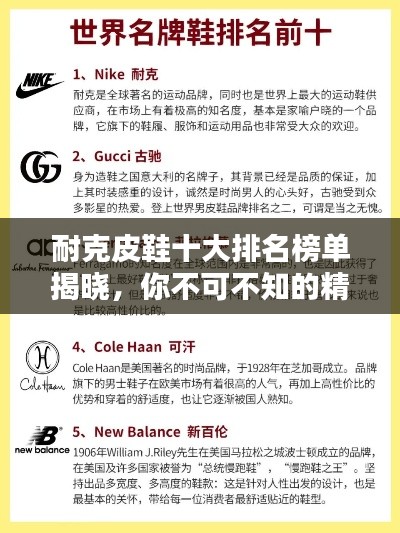 随着时尚潮流的不断发展,越来越多的人开始关注时尚鞋履市场,耐克作为世界领先的体育用品品牌之一,其皮鞋系列在市场上备受瞩目,本文将介绍耐克皮鞋排名前十名的产品,这些产品不仅在设计和品质上表现出色,同时也深受消费者的喜爱。