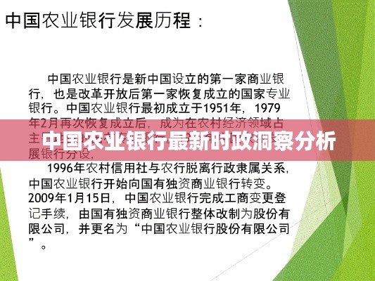 中国农业银行作为国内领先的金融机构之一,始终紧跟国家政策步伐,不断调整和优化自身业务结构,本文将对中国农业银行的最新时政动态进行分析,探讨其在当前宏观经济环境下的战略调整与业务发展。