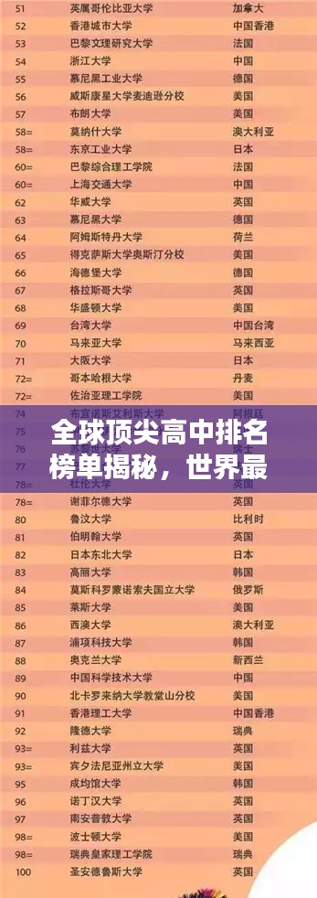 随着全球教育的不断发展和进步,世界各地的中学也在不断地提高自己的教育质量和水平,成为培养未来领袖和杰出人才的重要基地,在这篇文章中,我们将探讨世界最高的中学排名榜,介绍一些在世界上享有盛誉的高中学校,并了解它们的特点和优势。