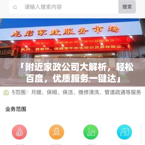 通过“百度一下附近家政公司”,可以方便快捷地找到优质的家政服务公司,在选择家政公司时,要注意查看公司资质、了解服务项目、客户评价和实地考察等方面,要选择知名品牌、对比价格并注重服务质量,家政公司的服务内容丰富多彩,可以根据家庭需求选择合适的服务项目,使用百度搜索附近的家政公司,让您的生活更加便捷、舒适。