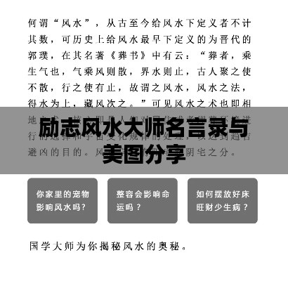随着社交媒体的发展,越来越多的人开始通过图片来传递信息和理念,风水大师励志语录”的图片也应运而生,这些图片通常融合了风水大师的经典语录、美丽的自然景观以及富有启发性的图案,给人们带来视觉与心灵的双重启示。