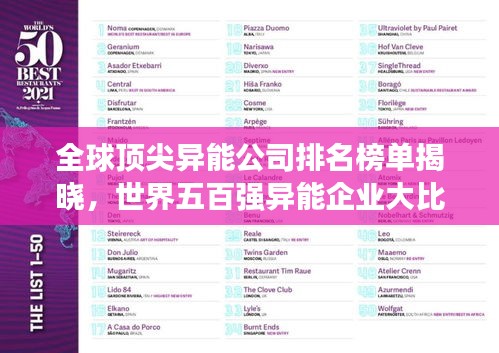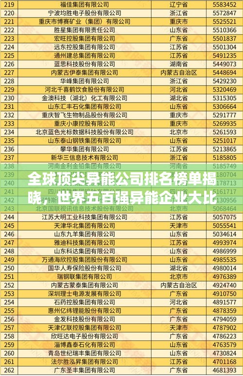 随着科技的飞速发展和人类认知的不断拓展,异能这一概念逐渐从科幻走向现实,在这个时代,一些拥有先进技术和异能研发能力的公司开始崭露头角,成为了全球范围内的佼佼者,本文将为您揭晓世界五百强异能公司的排名,带您了解这些引领科技潮流的异能巨头。