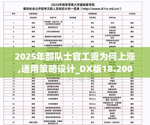 部队士官工资上涨,不仅是对军事力量的一种激励,也是社会稳定、经济发展的体现。针对“2025年部队士官工资为何上涨,适用策略设计_DX版18.200”的探讨,将涉及到多方面的政策因素,包括经济发展、国防需求和社会稳定等。在这一大背景下,分析部队士官工资上涨的原因及设计相应的策略便显得尤为重要。