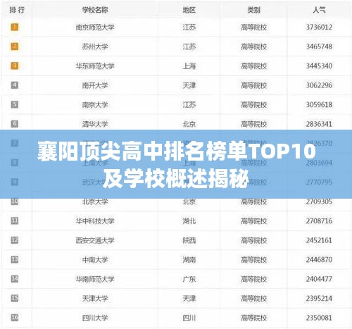 襄阳市作为湖北省的重要城市,其教育事业一直备受关注,高中教育作为培养未来社会精英的重要阶段,其质量和声誉尤为重要,本文将介绍襄阳前十名高中的排名及其特色。