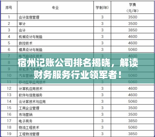 随着经济的繁荣发展,记账公司如雨后春笋般涌现,宿州作为一个经济活跃的城市,其记账公司的服务质量也备受关注,本文将为您带来宿州记账公司的排名,解读这些在当地财务服务行业中表现出色的佼佼者。