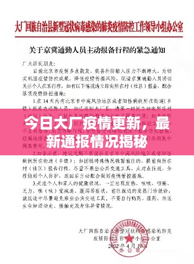 随着全球疫情形势的不断变化,各地疫情防控工作依然严峻,大厂疫情最新通报情况备受关注,本文将为大家介绍最新的疫情通报情况,以及大厂地区所采取的防控措施。
