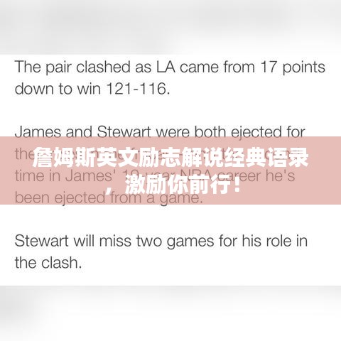在篮球世界里,詹姆斯无疑是一颗璀璨的明星,他的才华、毅力和不懈的努力使他成为了全球篮球迷的偶像,而他的英文励志解说语录更是鼓舞了许多人,让人们明白成功背后的艰辛与付出,本文将带你领略詹姆斯的励志解说语录,感受他的独特魅力。