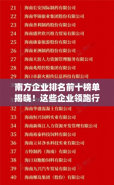 是南方企业排名前十名,这些企业在各自的领域内处于领先地位,拥有强大的实力和先进的技术,为南方地区乃至全国的经济社会发展做出了重要贡献,这些企业将继续发挥自身优势,不断创新和发展,为南方地区的经济社会发展注入新的动力。