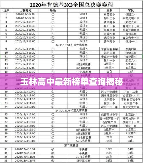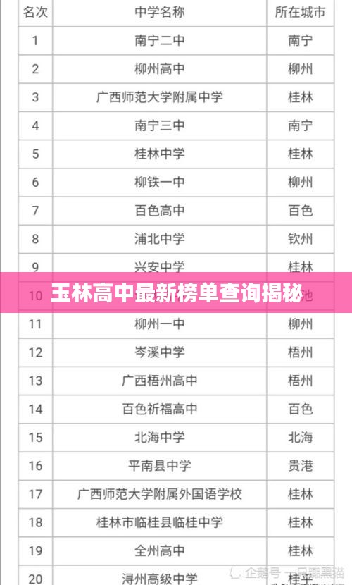 随着教育水平的提高,家长们对于学校的教育质量越来越重视,对于即将面临升学的学生和家长来说,了解当地高中的排名和表现是非常重要的,玉林高中榜单最新查询结果已经出炉,本文将对这一榜单进行详细介绍。