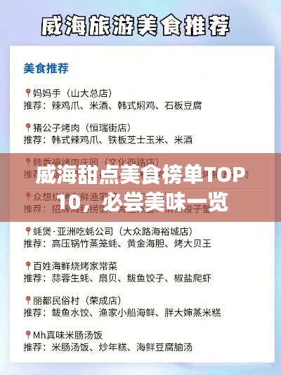 威海,这座美丽的海滨城市,不仅拥有迷人的海景和丰富的海鲜,还有着令人陶醉的甜点美食,你可以品尝到各式各样的甜点,每一款都有着独特的口感和风味,下面就为你介绍威海甜点美食排名前十名,带你领略这座城市的甜蜜魅力。