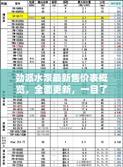 随着科技的进步和工程需求的多样化,水泵行业日益繁荣,劲派水泵作为行业知名品牌,以其卓越的性能和可靠的质量赢得了广大用户的信赖,本文旨在为广大消费者提供劲派水泵的最新售价表大全,以便大家了解并选购合适的产品。