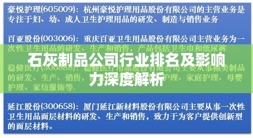 石灰制品行业是一个重要的工业领域,涵盖了石灰石开采、加工、销售等多个环节,随着经济的发展和建筑业的繁荣,石灰制品市场需求不断增长,市场竞争也日益激烈,本文将探讨石灰制品公司的排名及其行业影响力,以期帮助读者更好地了解这一领域的发展状况。