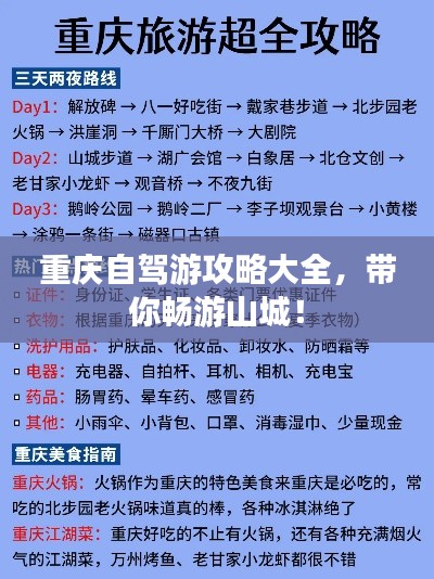 1. 记得随身携带身份证、驾驶证、行驶证以及车辆相关证件。 2. 建议携带相机、充电器、防晒用品等旅行必备物品。 3. 在景区内注意保持环境卫生,不乱扔垃圾。 4. 在品尝美食时,可以向当地人请教推荐餐馆和菜品。 5. 在游览过程中,注意保持体力,合理安排休息时间。 6. 在预订酒店和门票时,提前了解退订和改签政策,以防万一。 7. 注意保管好个人财物,尤其是在人流密集的景区。 九、结束语 重庆是一座充满魅力的城市,自驾游能更好地体验和感受这座城市的独特魅力,希望本攻略能为您的重庆之行提供有益的参考和帮助,祝您旅途愉快!