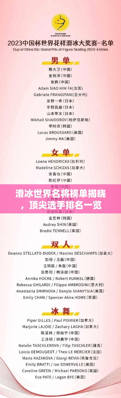 滑冰运动作为冬季奥运会的核心项目之一,在全球范围内拥有广泛的关注与热爱,本文将为您介绍滑冰世界名将排名,带您领略这些顶尖选手的风采。