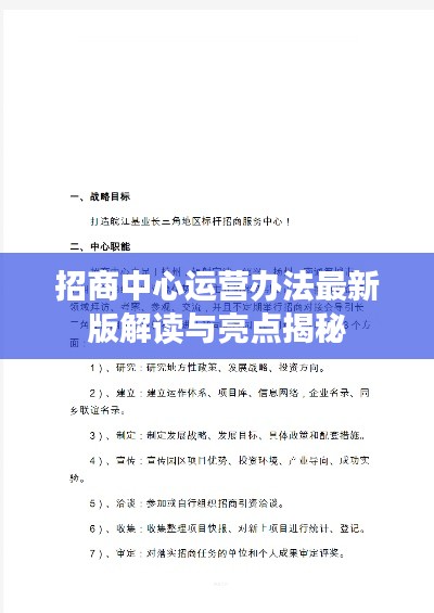 随着市场环境的不断变化和招商工作的深入推进,我们有必要对招商中心的运营办法进行更新和调整,本文旨在阐述招商中心运营办法最新版,以指导日常运营工作,促进招商工作的高效开展。