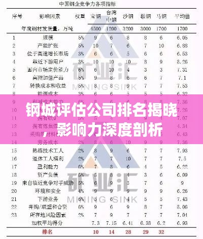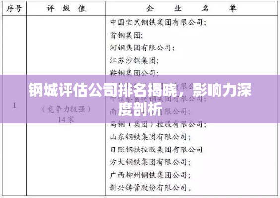 随着钢铁行业的快速发展,钢城评估公司的角色日益凸显,这些公司在钢铁产业链中扮演着至关重要的角色,为投资者、企业和政府提供有关钢铁产业的评估、咨询和战略规划服务,本文将探讨钢城评估公司的排名及其影响力。