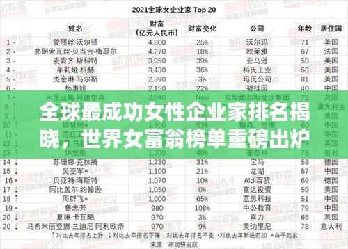随着全球经济的不断发展和壮大,女性企业家逐渐崭露头角,成为世界商业舞台上的重要力量,本文将为您揭示全球最成功的女性企业家——世界女富翁排名,这些杰出的女性凭借其卓越的商业头脑、独特的领导能力和不懈的努力,成功跻身全球富豪之列。