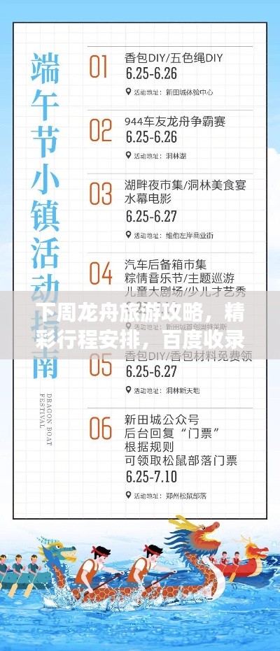10、在旅行过程中,可以尝试参加当地的民俗活动,如包粽子、赛龙舟等,更好地体验当地的文化氛围,下周的龙舟旅游攻略需要你提前做好充分的准备和规划,通过本次旅行,你将能够深入了解龙舟文化的历史、发展和现状,感受浓厚的节日氛围,品尝各地的美食,留下美好的回忆,希望你在旅行过程中能够遵守注意事项,确保旅行的安全和愉快。