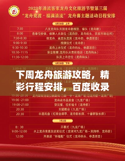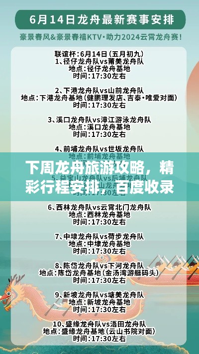 随着端午节的临近,龙舟赛成为了各地庆祝活动的一大亮点,对于热爱旅行和探索的你来说,何不借此机会,规划一场充满活力和文化气息的龙舟旅游行程呢?本文将为你提供下周的龙舟旅游攻略,带你领略龙舟文化的魅力。