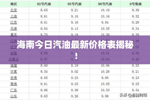 随着汽车的不断普及,汽油价格成为了广大车主们关注的焦点,本文将为大家带来关于海南地区汽油最新价格的今日表,帮助车主们了解当地油价动态,合理安排加油计划。