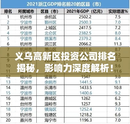 义乌市作为浙江省的重要城市之一,其经济发展势头强劲,尤其是高新区的发展引人注目,在此背景下,义乌高新区投资公司的发展也备受关注,本文将探讨义乌高新区投资公司的排名及其影响力,揭示其在推动地方经济发展中的重要角色。
