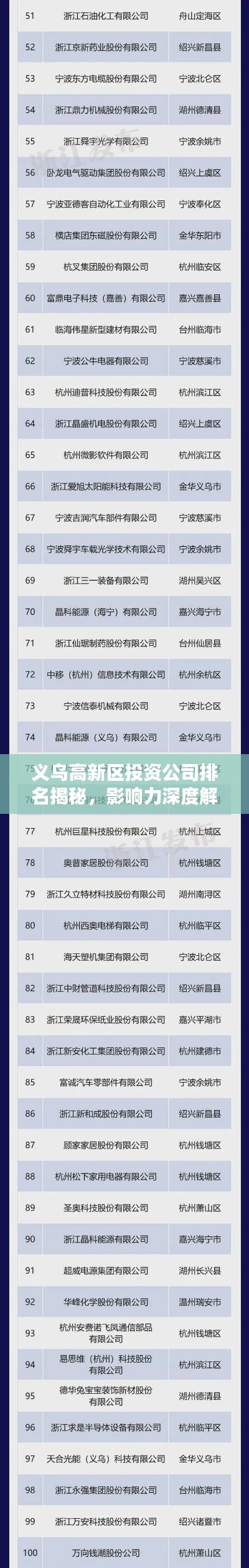 关于义乌高新区投资公司的排名,目前并没有官方的权威排名数据,但根据行业影响力、投资规模、项目质量等因素,我们可以对部分公司进行简要的分析和评估,以下内容仅为示例,并非具体排名: