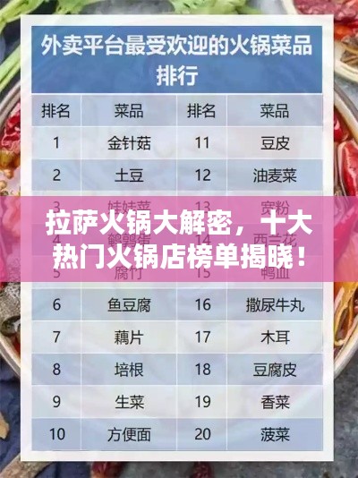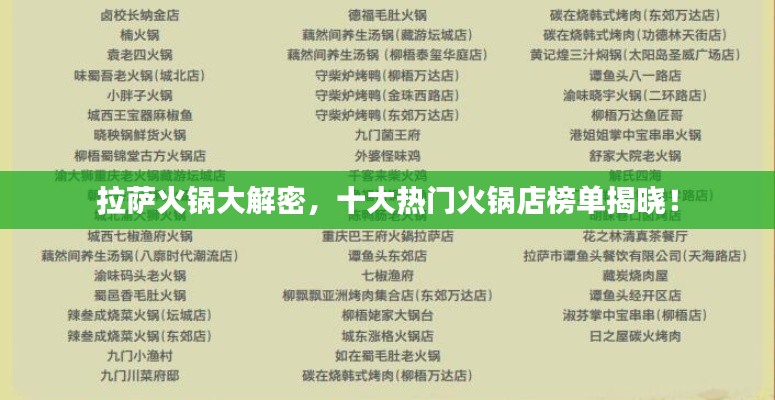 拉萨,这座神秘而古老的城市,以其独特的文化和美丽的自然风光吸引着无数游客,随着时代的变迁,火锅这一美食文化也逐渐在拉萨扎根并蓬勃发展,本文将为您介绍拉萨火锅排名前十名,带您领略这座城市中的火锅魅力。