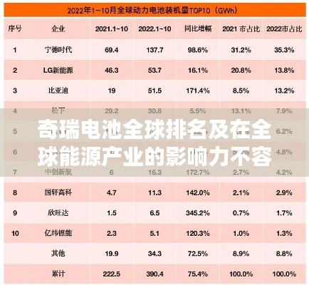 随着新能源汽车市场的蓬勃发展,电池技术成为了汽车产业关注的焦点,在众多电池制造商中,奇瑞电池凭借其卓越的性能和创新的技术,在全球范围内崭露头角,本文将深入探讨奇瑞电池的世界排名及其在全球能源产业的影响。