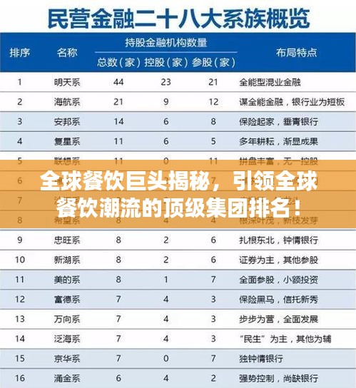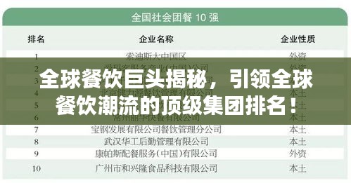 在全球经济一体化的今天,餐饮业早已突破了地域的界限,成为了国际间交流与合作的热门行业,而在这一行业中,一些餐饮集团凭借其卓越的表现和持续的创新,脱颖而出,成为了全球餐饮界的佼佼者,本文将为您介绍几家世界排名餐饮集团,揭示它们如何引领全球餐饮业的发展。