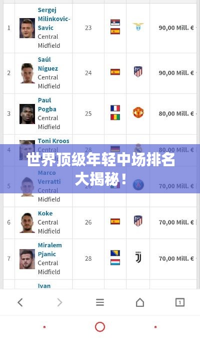 足球场上,中场是球队的灵魂,而年轻的中场球员更是未来的希望,他们凭借出色的技术、敏锐的洞察力和无限的潜力,成为了世界足坛的璀璨明星,本文将为您揭示世界顶级年轻中场的排名,带您领略这些年轻才俊的风采。