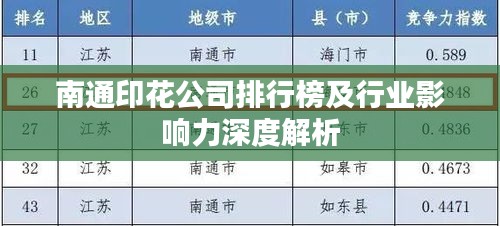 南通,这座位于中国东海岸线的城市,以其繁荣的纺织业和丰富的工业资源著称,印花行业作为纺织产业链的重要环节,在这里得到了长足的发展,本文将为您详细介绍南通印花公司的排名及其行业影响力。