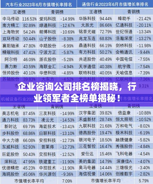 随着市场竞争的日益激烈,企业对管理、战略、运营等方面的需求不断提升,企业咨询公司作为专业提供解决方案的服务机构,其重要性愈发凸显,本文将为您揭晓当前的企业咨询公司排名榜,带您了解行业领军者。