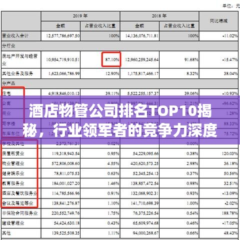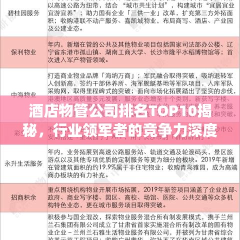 在酒店行业中,物业管理服务扮演着至关重要的角色,随着酒店行业的快速发展,酒店物业管理公司的竞争也日益激烈,本文将为您揭晓酒店物管公司排名前十,这些公司在业界内以其卓越的服务质量、创新的管理模式和良好的口碑赢得了广泛的认可。