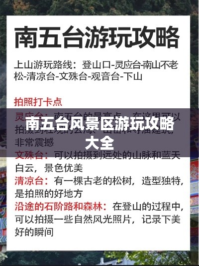南五台风景区是一个集自然风光、历史文化、休闲度假为一体的旅游胜地,本文提供的攻略希望能为您的旅行提供帮助,让您更好地了解并游览这一风景名胜,在此,我们诚挚邀请您来南五台风景区,感受其独特的魅力,留下美好的回忆,祝您旅途愉快!