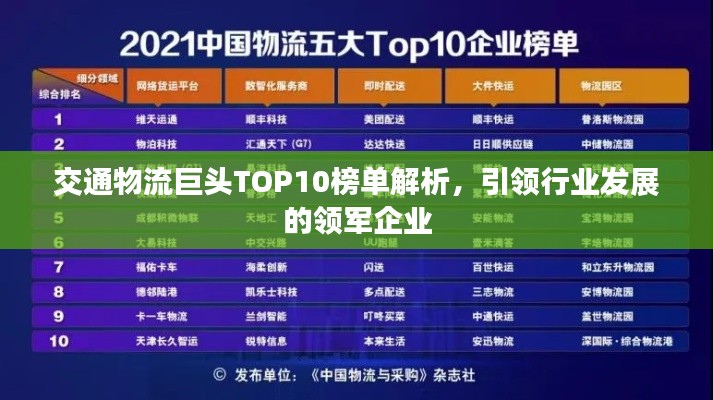 随着全球经济的不断发展和电子商务的繁荣,交通物流行业迎来了前所未有的发展机遇,本文将为您揭晓交通物流排名前十名的企业,这些企业在行业内以其卓越的服务质量、高效的物流网络和创新能力脱颖而出,引领着全球物流行业的发展潮流。