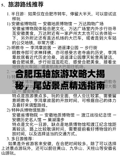 合肥,这座美丽的城市,以其丰富的历史文化和现代化的城市风貌吸引着无数游客,本文将为您带来一份合肥押尾旅游攻略,带您领略这座城市的魅力。