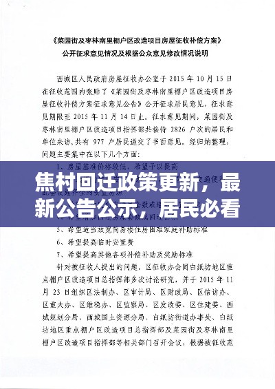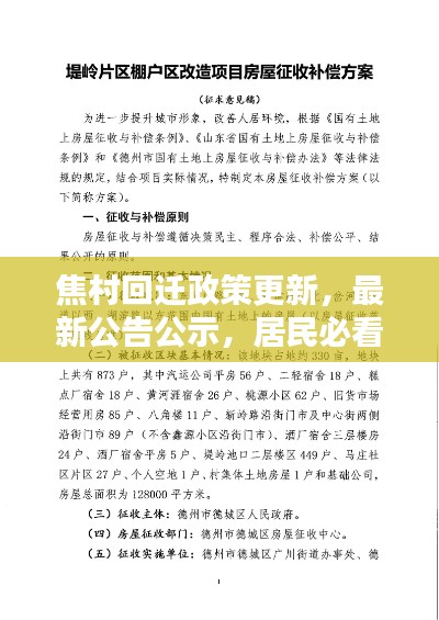 是焦村回迁政策的最新公告公示,希望广大居民能够及时了解并积极参与,焦村回迁工作的顺利进行,离不开每一位居民的配合与支持,让我们共同努力,为焦村的明天创造更加美好的生活环境!