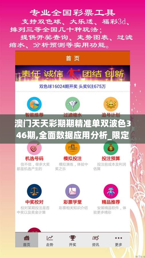 澳门天天彩期期精准单双波色346期,全面数据应用分析_限定版4.265不仅仅是一份数据分析报告,更是一份详尽的澳门天天彩第346期的数据记录。它详细记录了第346期的中奖号码、奖金分配、中奖概率等数据信息。通过对这些数据进行挖掘和分析,我们得到了以下的结论:
