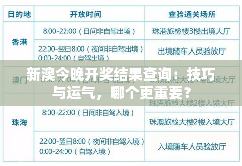 新澳以其独特的地理位置和繁荣的娱乐产业闻名于世。作为澳门政策的一部分,彩票业在特区的经济体系中扮演着重要角色。随着开奖结果的不断公布,无数的新老彩民和赌客都在探索着那个古老而有趣的话题:在彩票开奖中,技巧与运气,究竟哪个更关键?本文将探讨这一问题,并提供一些关于新澳今晚开奖结果查询的信息和建议。