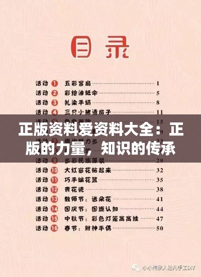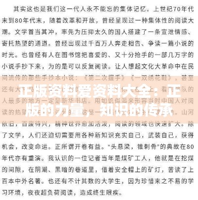 在数字化快速发展的今天,知识和信息的获取方式日新月异,为人们带来了极大的便利。然而,随之而来的还有对版权保护的挑战。正版资料,作为知识产权的重要组成部分,不仅关系到个人和企业的合法权益,更是对知识代际传承和文化繁荣的有力保障。本文将探讨正版资料爱资料大全的意义,即正版的力量以及知识的传承,倡导在澳门政策文件中进一步强化对正版资源的支持和保护。